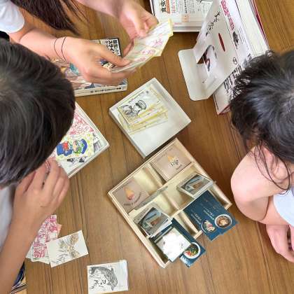 3枚目 プレゼントしおりを楽しそうに選んでいました。心のこもった美術部の手書きしおりが人気です!
