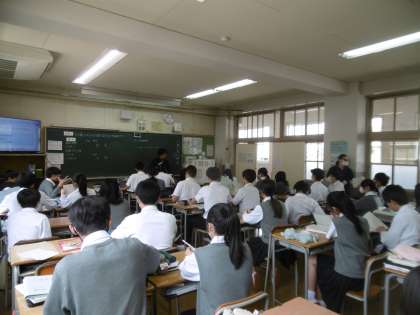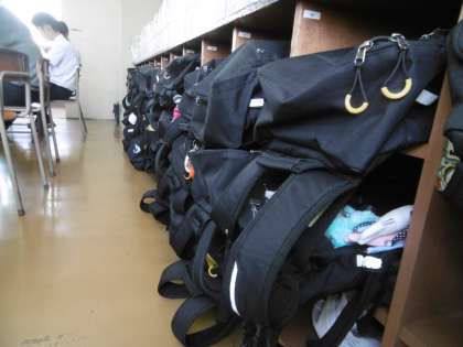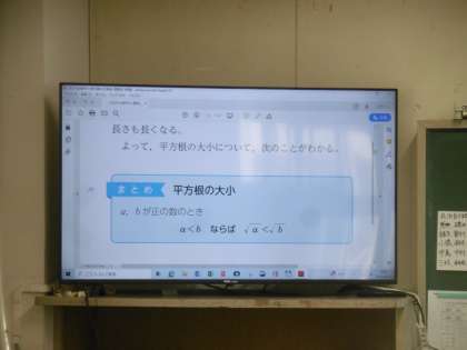 学習内容は「平方根の大小」でした。写真は授業前の小テストを受けているところです。さすが3年生です。通学カバンもきちんとロッカーに入れられていて、感心しました。