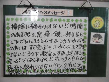 温かい学年を創るために、今日も学年主任が子どもたちにメッセージを書いていました。「時間を無駄にすることなく、掃除を精一杯すること」という内容でした。週末には宿泊学習も控えています。がんばりましょう。
