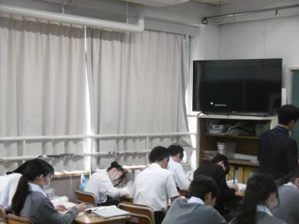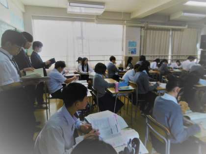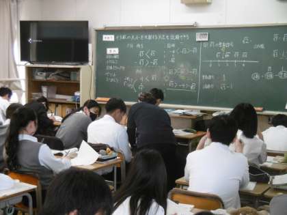 授業のめあては「平方根の大小を比較する方法を説明できる」でした。教室でたくさんの教え合い(学び合い)が行われていました。授業を参観している教育実習生も真剣な態度でした。