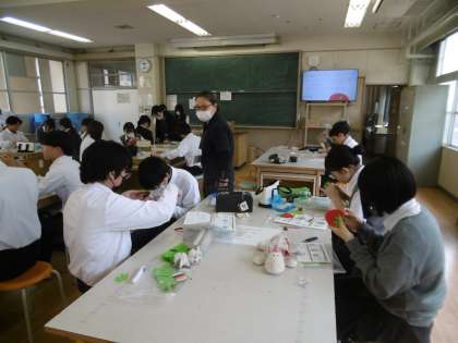 裁縫実習を行っていました。いちごとメロンの課題を作製するために、玉どめ、玉結び、並縫いを懸命に行っていました。子どもたちは集中力を切らさずに、最後まで作品作りに臨んでいました。