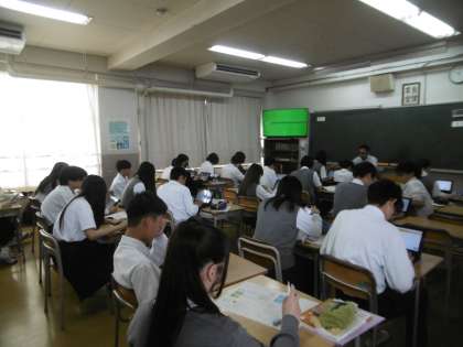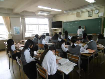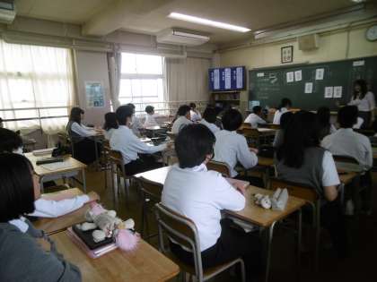 写真は上から、2年1組(自習)、2年2組(国語)、2年3組(女子保健)です。1組では、タブレットパソコン内にある学習用教材(キュビナ)を使って子どもたちは復習をしていました。2組では、熟語の構成についての授業が行われていました。3組の女子保健では、「傷害の発生要因」について、授業が行われていました。とても静かな3階でした。