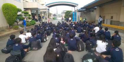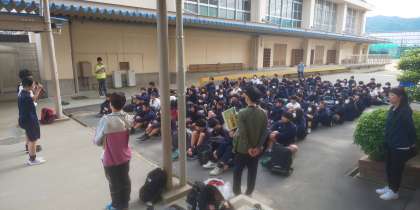 出発式の様子です。実行委員長の挨拶もとても立派でした。たくさんの他学年の先生方も出発式に参加してくれました。このあと、バスに向かいます。