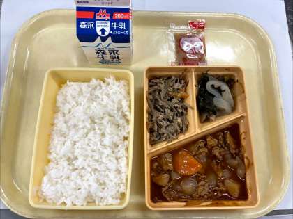 今日のメニューは、白ごはん、ポークハヤシライス、ごぼうサラダ、ごまドレッシング、ベーコンとほうれん草の炒め物、牛乳です。