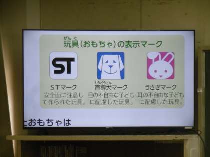 学習内容は「幼児と遊び」でした。子どもが使うおもちゃに表示されている「STマーク」についての説明がありました。子どもたちは先生の話を静かに聞くことができていました。