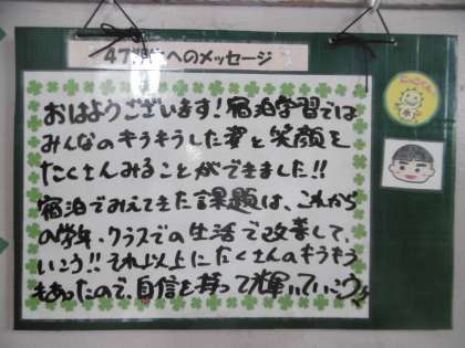 宿泊学習をがんばった2年生へのメッセージが書かれていました。今日から気持ちを切り替えて、学校生活に臨みましょう。