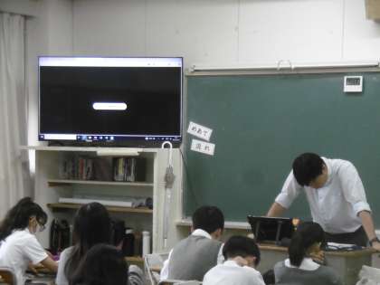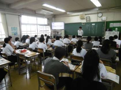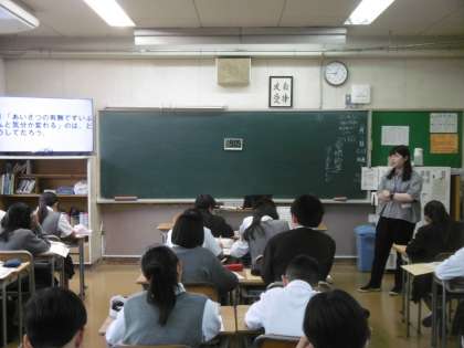 教材名は「愛情貯金」、主題名は「あいさつの大切さ」、内容項目は「礼儀」でした。授業のねらいは「あいさつには、互いの存在を認め合い、心を温め合うことで、人と人との関係を深める力があることの自覚を通して、時、場所、場面に応じて適切な言動をしようとする態度を育てる」でした。授業の導入場面で、録音された教材をみんなで聞いてから、各担任による授業が始まっていました。写真は上から、1年1組、1年2組、1年3組です。