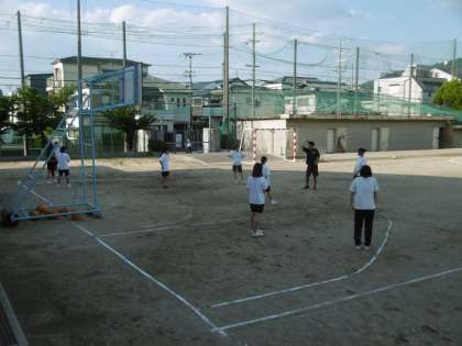 写真は上から、女子バレー部、サッカー部、女子バスケットボール部です。どの部も3年生の最後の夏に向かって、努力を積み重ねています。