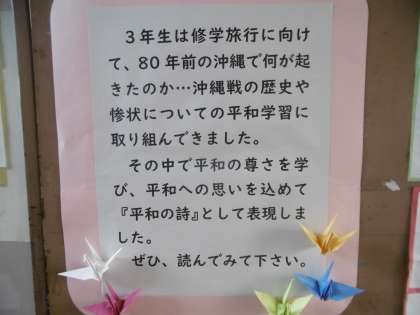 3年生が過ごす2階廊下に、来週の沖縄修学旅行に向けて、子どもたち一人ひとりが考えた「平和の詩」が掲示されています。期末懇談で来校の際に、是非ご覧ください。