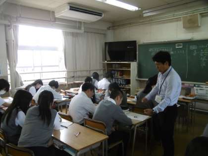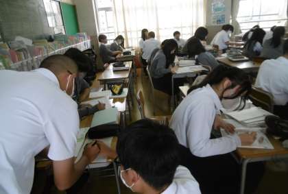 配られた学習プリントを一生懸命に解いていました。教室のいたるところで、班活動による学び合い(協同学習)が行われていました。