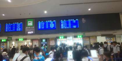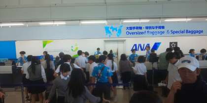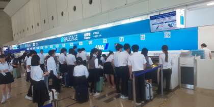 那覇空港に着いて、手荷物検査をしました。このあと、14時5分に離陸予定です。ここまで46期生は、とてもよく集団行動ができています。大阪国際空港は16時到着予定です。
