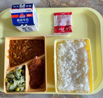 今日のメニューは、白ごはん、ドライカレー、米粉ささみカツ、ポパイソテー、ミルメーク、牛乳です。