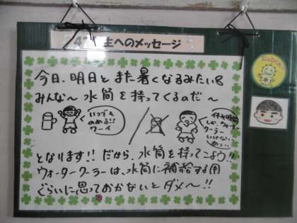 熱中症対策についてのメッセージでした。昨日から急に気温が高くなっています。飲み物を多めに持たせるなどの配慮をお願いいたします。