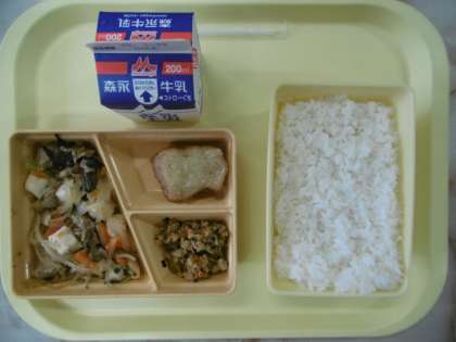 今日のメニューは、白ごはん、豆腐のチャンプル、いかナゲット、鉄火味噌、牛乳です。