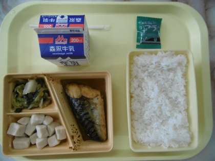 今日のメニューは、白ごはん、鯖の生姜煮、高野豆腐の含め煮、おひたし、のりの佃煮、牛乳です。