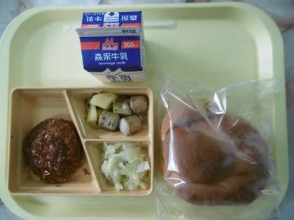 今日のメニューは、バーガーパン、ミンチカツソースかけ、ソーセージときのこのアヒージョ風、キャベツソテー、牛乳です。