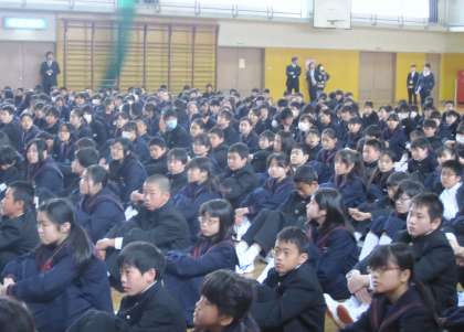 全校生徒が体育館に集まり、学校長式辞・転入された先生方のあいさつ・担任等の発表などがありました。