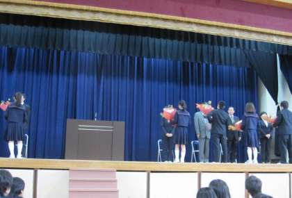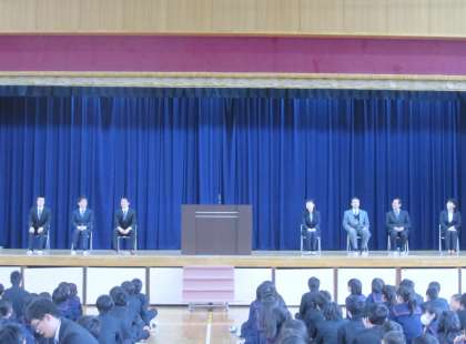 本日6限、離任式が行われ、本校を離任された7名の先生方からご挨拶をいただきました。