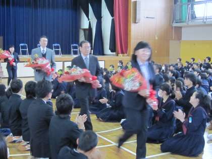 授業や部活動でお世話になった先生方に、離任式後も多くの生徒が集まって別れを惜しんでいました。