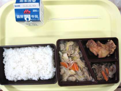 献立は白ごはん、八宝菜、こんにゃくのチャプチェ、鶏肉の唐揚げ、牛乳(計854キロカロリー)です。