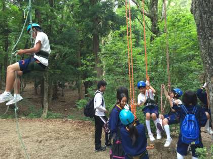 プログラムのツリークライミングを行っています。コツをつかんだ人はとても高いところまで登っています。