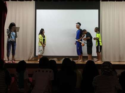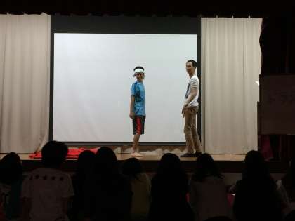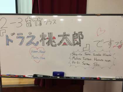 林間の3組のクラスレクのメインである劇の様子です。生徒たちが考えた劇に担任の吉竹先生も特別出演しました。劇はとてもおもしろく、とても盛り上がりました。