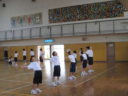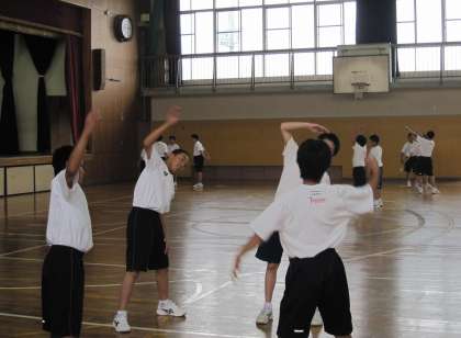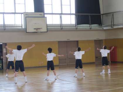 1年生・男子体育の授業で、グループに分かれてラジオ体操の練習をしています。