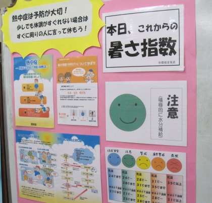 また、保健室横(クラブ黒板前)には毎日「暑さ指数」が掲示されていて、熱中症予防を呼びかけています。