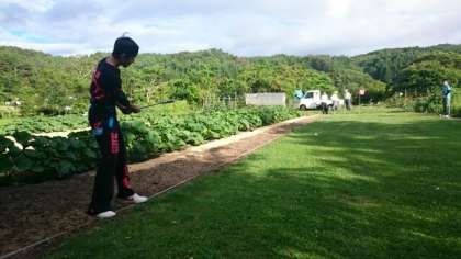 ゴルフとゲートボールの間のような「マレット」というスポーツ。農業の合間に体験させてもらっていました。なかなか奥が深くてむずかしい!