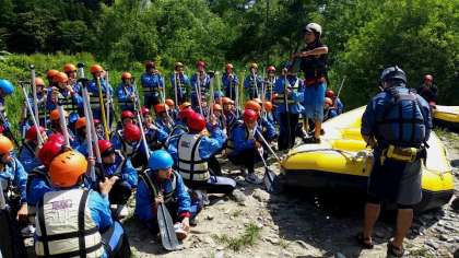 チームで気持ちをあわせて急流をくだります。インストラクターのお兄さんの紹介でまたもりあがります。