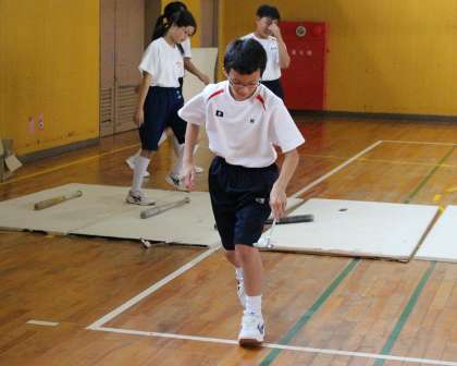 ぐるぐる10回まわった直後に、お玉に乗せたピンポン玉を落とさないように運びます。
