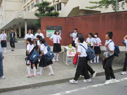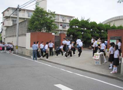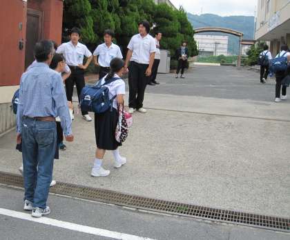 生徒会役員に学級委員も加わり、明るいあいさつの声が交わされています。