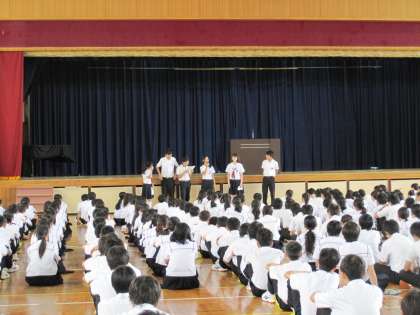 また、生徒会長より「Fresco Contina」の取り組みについて提案がありました。玄関前廊下にみんなで作成した短冊で涼しげなカーテンを作り、暑い夏を乗り切ろうというものです。楽しみですね。