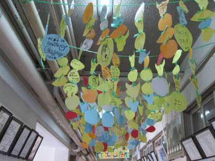 暑い夏を乗り切ろうと、生徒会の企画で情熱的でさわやかなメッセージを校舎1階廊下に飾り付けています。