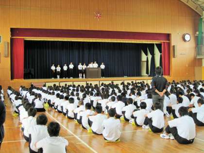 「漢字検定」合格生徒、体育大会大縄跳び優勝・準優勝クラス、体育大会新記録(2年男子80m)生徒の表彰を行いました。