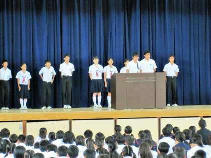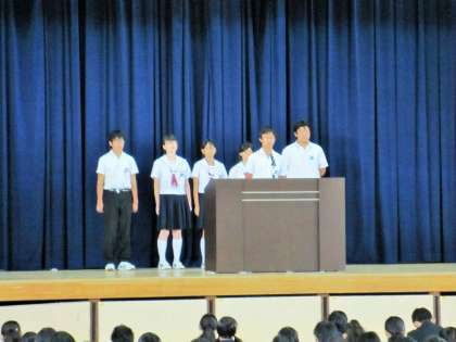 続いて、後期生徒委員および生徒会役員の認証式を行った後、前・後期生徒会役員からあいさつがありました。