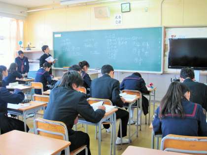 5限の時間割どおり、3年生の分割授業と1年生のチームティーチング授業をご覧いただき、落ち着いて意欲的に取り組んでいる様子に感心しておられました。