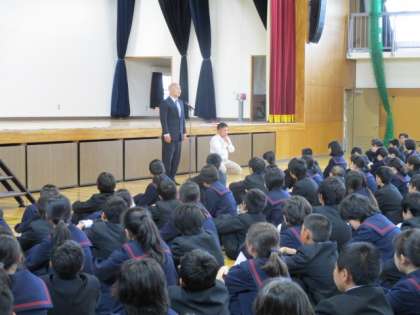 地震を想定した避難訓練を行いました。今回の地震で熊本県に戻られていた水谷先生のお話は聴く生徒、教員の心を打ちました。その後、緊急時・非常時における集団登下校のグループを全校生徒・全教員で確認をしました。