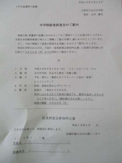 1年生の保護者の方を対象に給食の試食会を6月16日(木)12:00〜本校で行います。本日、子どもたちがご家庭に案内プリントを持ってかえりますので、詳細につきましてはご覧ください。