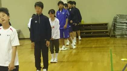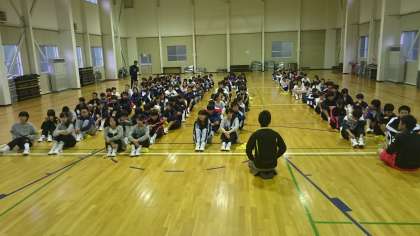 林間学舎2日です。あいにく小雨が降っています。多少プログラムを変更して行い、着替えを考慮してグループによっては私服で活動します。体育館で朝の集いを行っています。