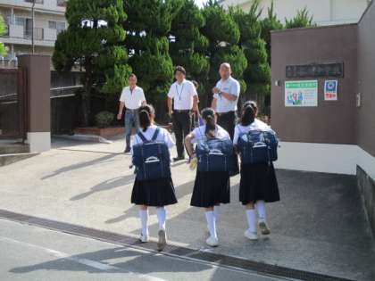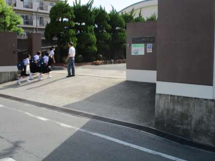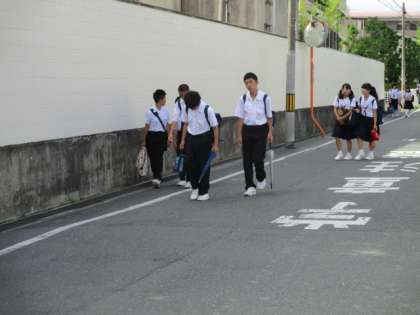 朝から蒸し暑いです。綺麗になった壁を見ながら生徒が登校します。