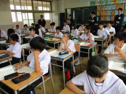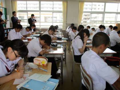 本日、2限目に市教委から指導主事の方々に来ていただき、授業の様子を見ていただきました。写真は仮屋園先生が1年4組で国語の授業をしました。