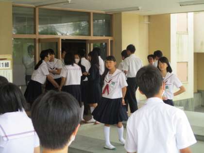 メンバーが集まるのを配膳室前で待っています。揃ったクラスから食缶等を取りに行きます。
