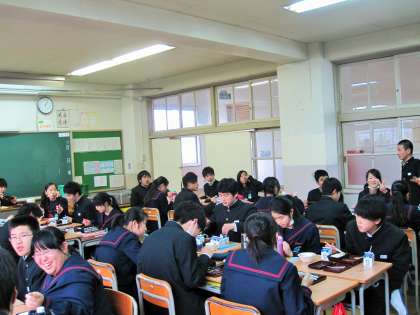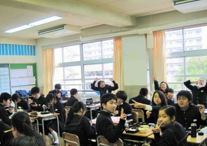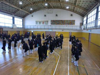 写真(下)は学年集会でクラスごとに整列を競っている様子です。出席番号順を背の順に並び替えています。しかも一言もしゃべらずにという厳しい?条件の中、1分以内に整列完了という新記録が出ました。