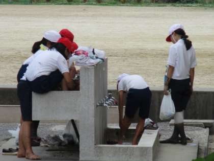 深野小学校5年生が午後から谷川中学校近隣で田植えをしました。田植えが終わった後、手と足を洗うために本校を訪れました。