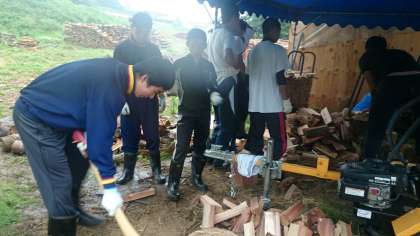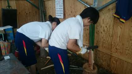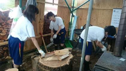 太い大きな木を斧で割ったり、細く枝にする作業をさせていただいています。