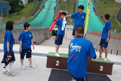 白馬ジャンプ競技場に、表彰台があり、スキー板やゼッケンといった小道具も準備されていました。