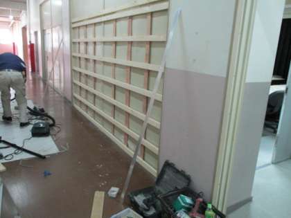 大東市教育委員会のお取りはからいで、以前から壊れていたパソコン室の壁を業者の方が来ていただき修理していただいています。本当に感謝です。