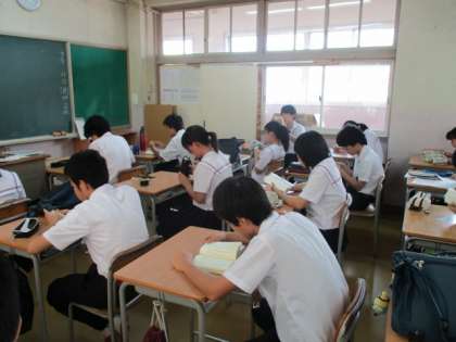 終業式まで後、7日になりました。今日も暑い一日です。朝読は3年2組の様子です。