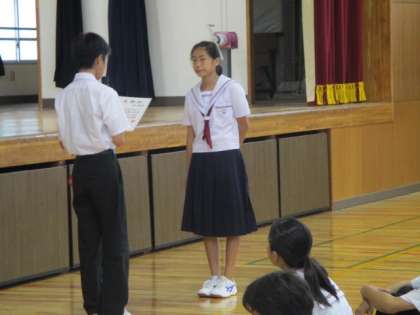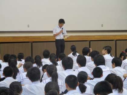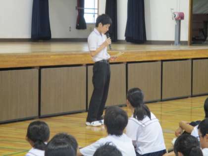 今日は生徒会主催の生徒集会です。図書委員会、美化委員会、表彰、生徒会から話しがありました。